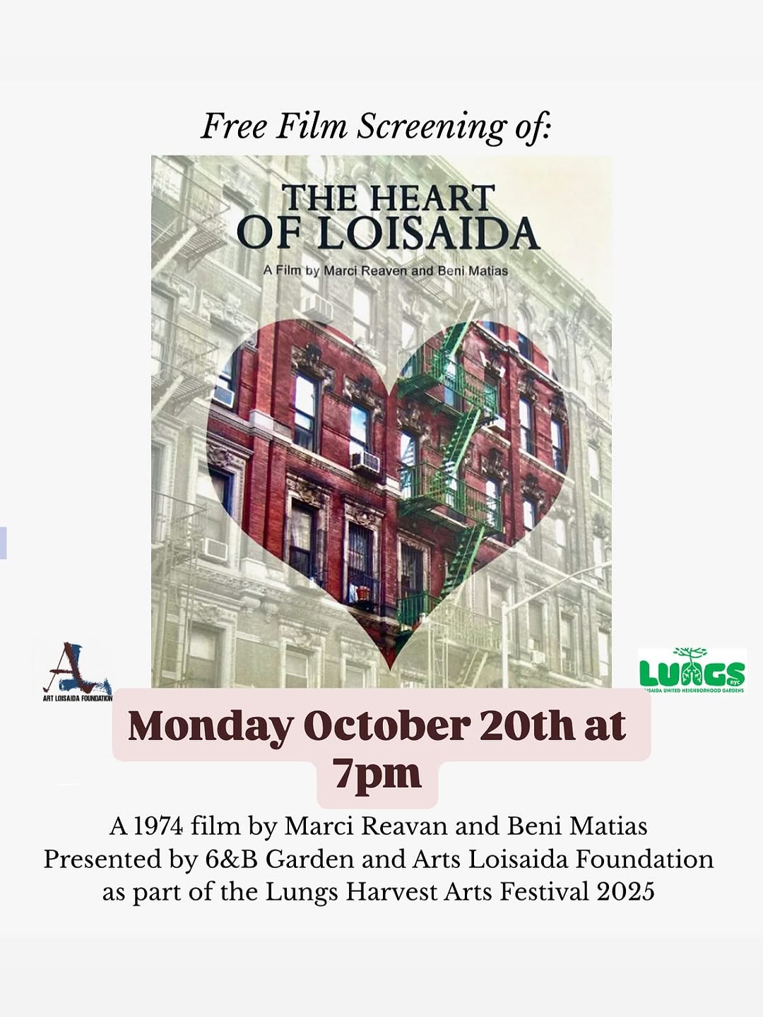The 1974 film The Heart of Loisaida documents efforts made by local, predominantly Latino residents to revive abandoned buildings through hard work and persistence. Directed by Marci Reavan and Beni Matias.