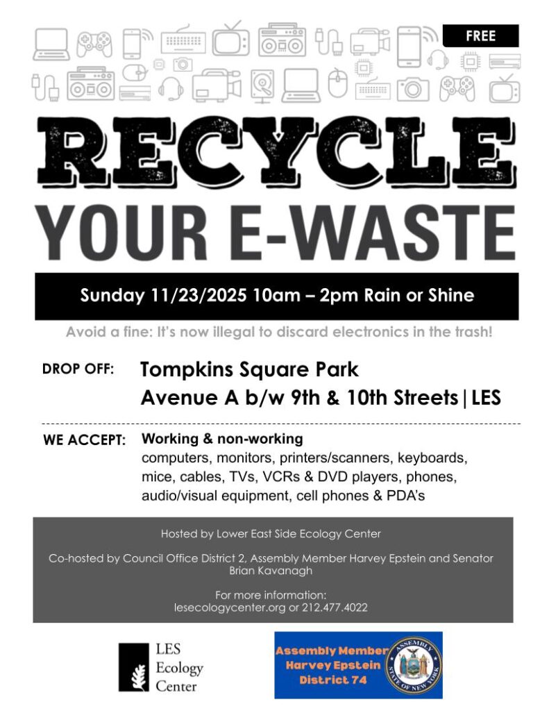 Get rid of your old electronics safely thanks to our friends at the Lower East Side Ecology Center! Please note LESEC can no longer accept media (DVDs, Disks, VHS tapes etc.),or batteries. Rechargeable batteries can be recycled at stores that sell them. Visit lesecologycenter.org for a list of acceptable electronics.