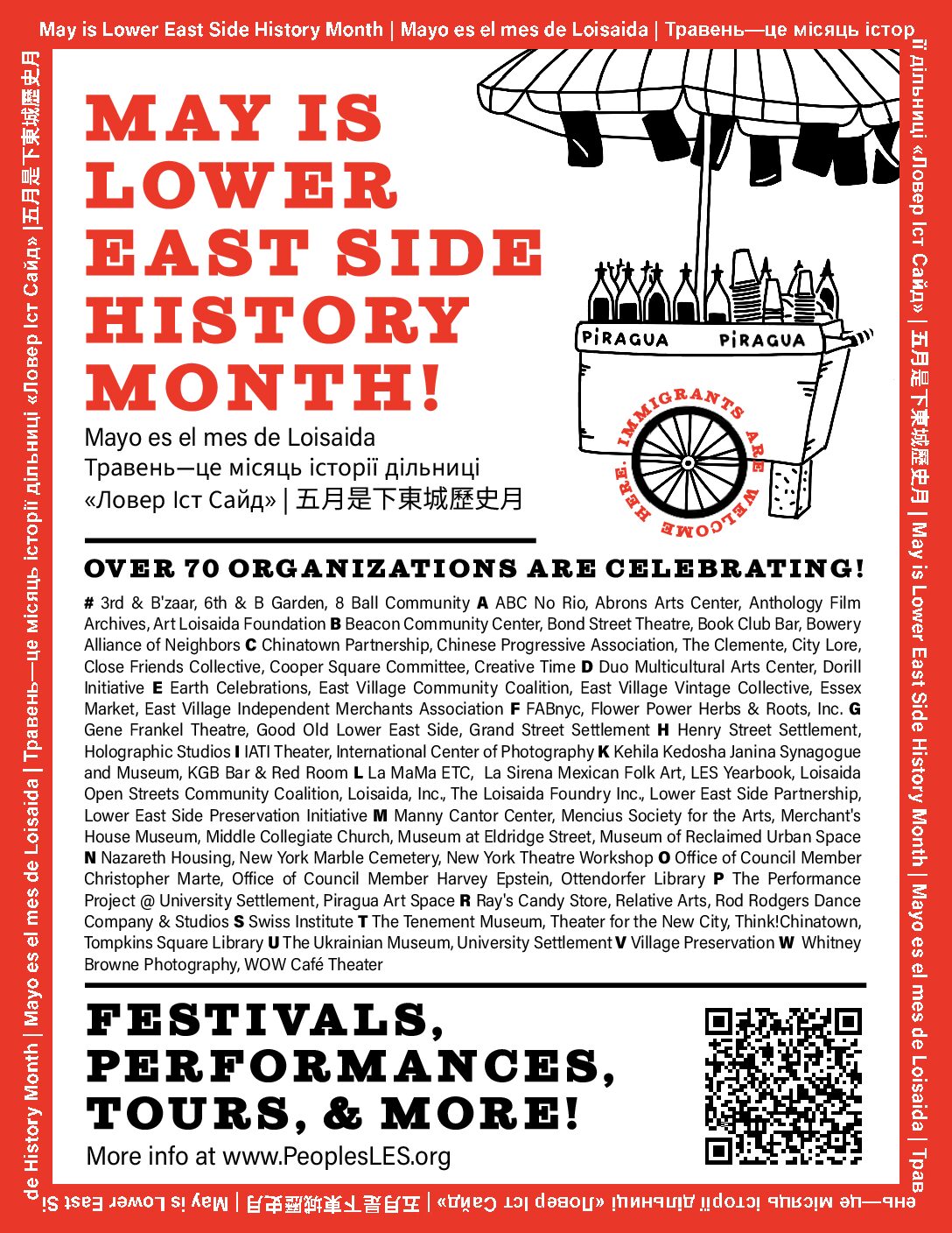 Lower East Side History Month is an annual celebration of the stories and people of the LES, organized by our friends at FABnyc! This year, over 70 organizations — including museums, arts nonprofits, community centers, small businesses, and gardens– will host learning opportunities, tours, performances, and public events!