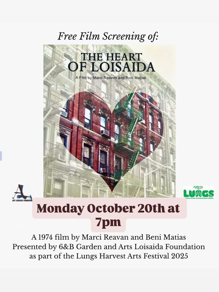 The 1974 film The Heart of Loisaida documents efforts made by local, predominantly Latino residents to revive abandoned buildings through hard work and persistence. Directed by Marci Reavan and Beni Matias. FREE showing 7pm Oct 20 (rain date) at 6B Community Garden! […]